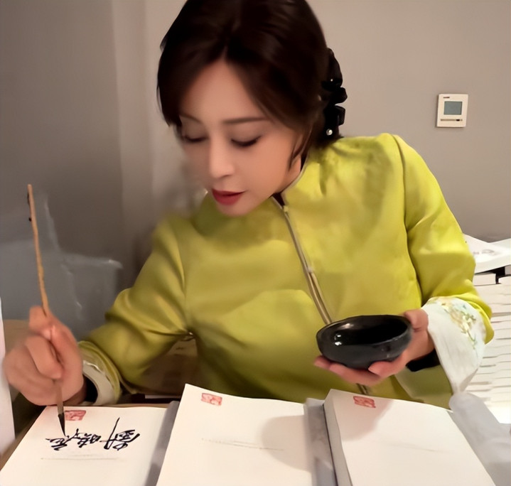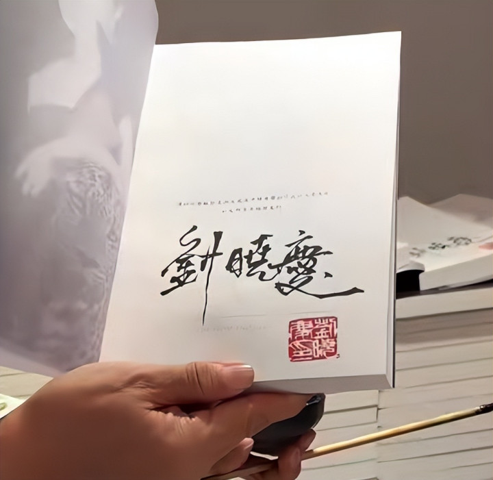 随后她还随意在面前摆开的一本书用毛笔在上面写了小楷书法的签名。
